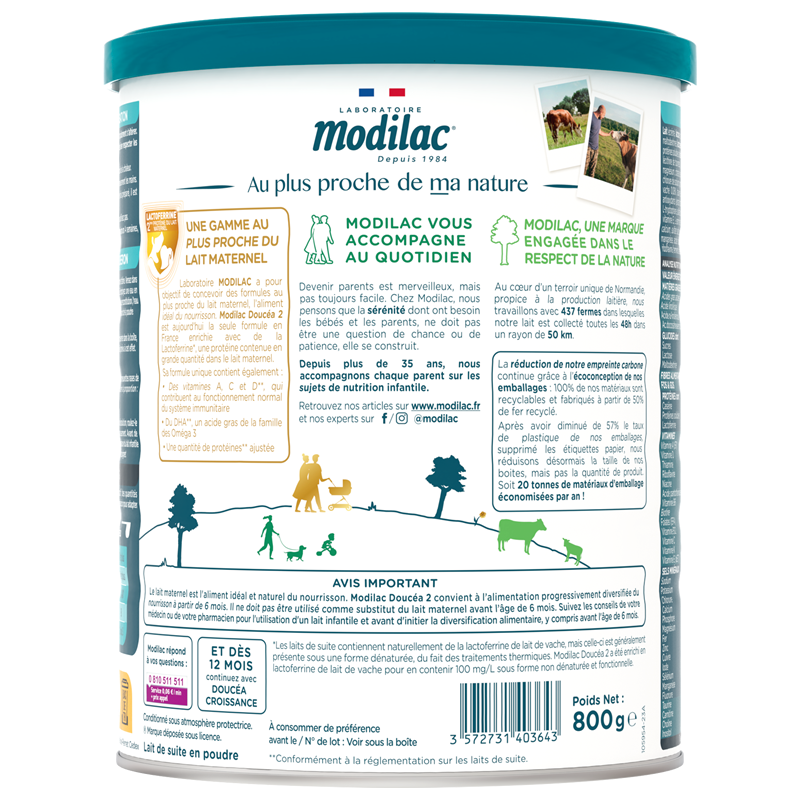 Bổ sung hàm lượng Lactoferrin cao, cùng lợi khuẩn Bifidobacterium và tăng chất lượng Protein khiến Modilac Doucéa trở thành sản phẩm được hàng triệu mẹ tại nhiều nước trên toàn cầu lựa chọn. Modilac Doucéa là sản phẩm của tập đoàn Savencia, tập đoàn top 5 toàn cầu về sản xuất bơ sữa.